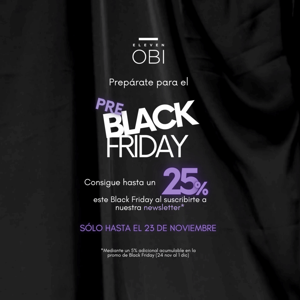 La campaña pre Black Friday de noviembre de Eleven Obi será válida exclusivamente para usuarios suscritos a nuestra newsletter desde el formulario a través de la página web www.elevenobi.com y que queden correctamente reflejadas en el sistema entre el 30 de octubre y el 23 de noviembre de 2025. Esta promoción excluye las muestras.